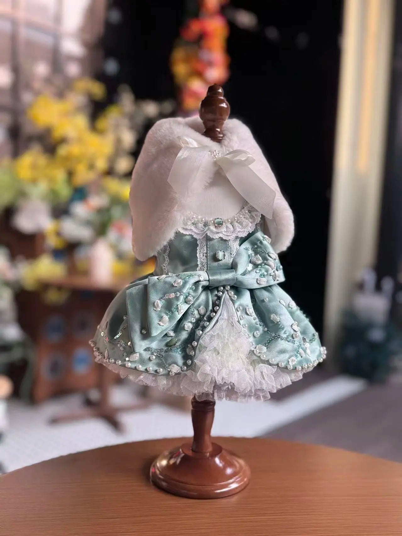 This princess dress is crafted from triacetate fabric, known for its elegant drape and silky-smooth luster. Adorned with intricate hand-applied beading in a refreshing mint green hue, it exudes a sophisticated and luxurious feel, creating a haute-couture-inspired look for your pet.