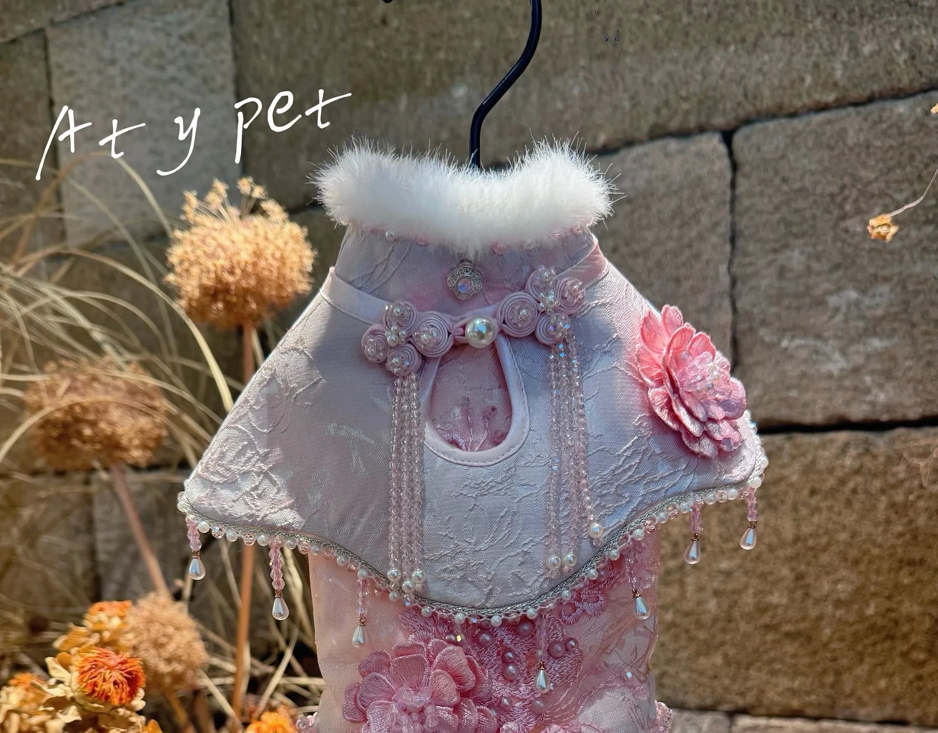 Designed for pet holiday dressing, this pink Chinese-style Qipao features traditional frog buttons and delicate embroidery for an elegant look. The sweet pink tone adds charm. With a tailored fit and comfortable fabric, it lets your pet shine during festive celebrations—perfect for New Year photos or family gatherings.